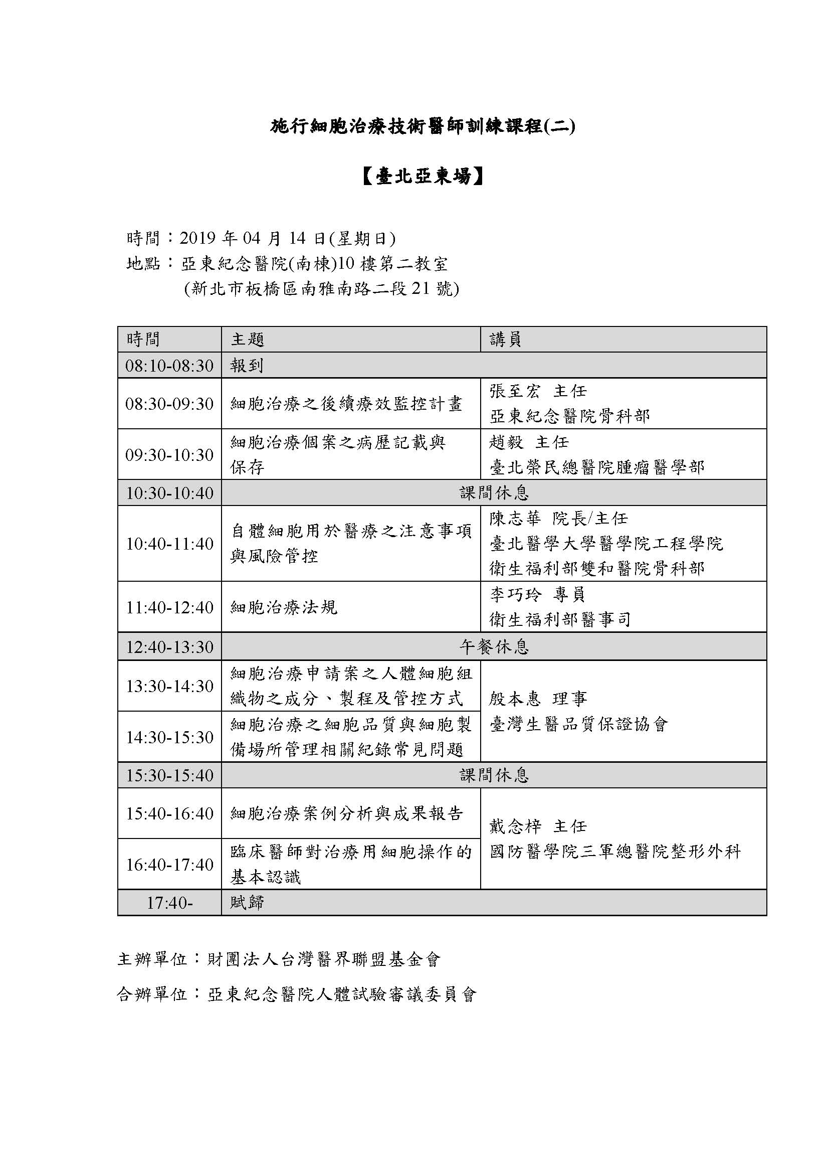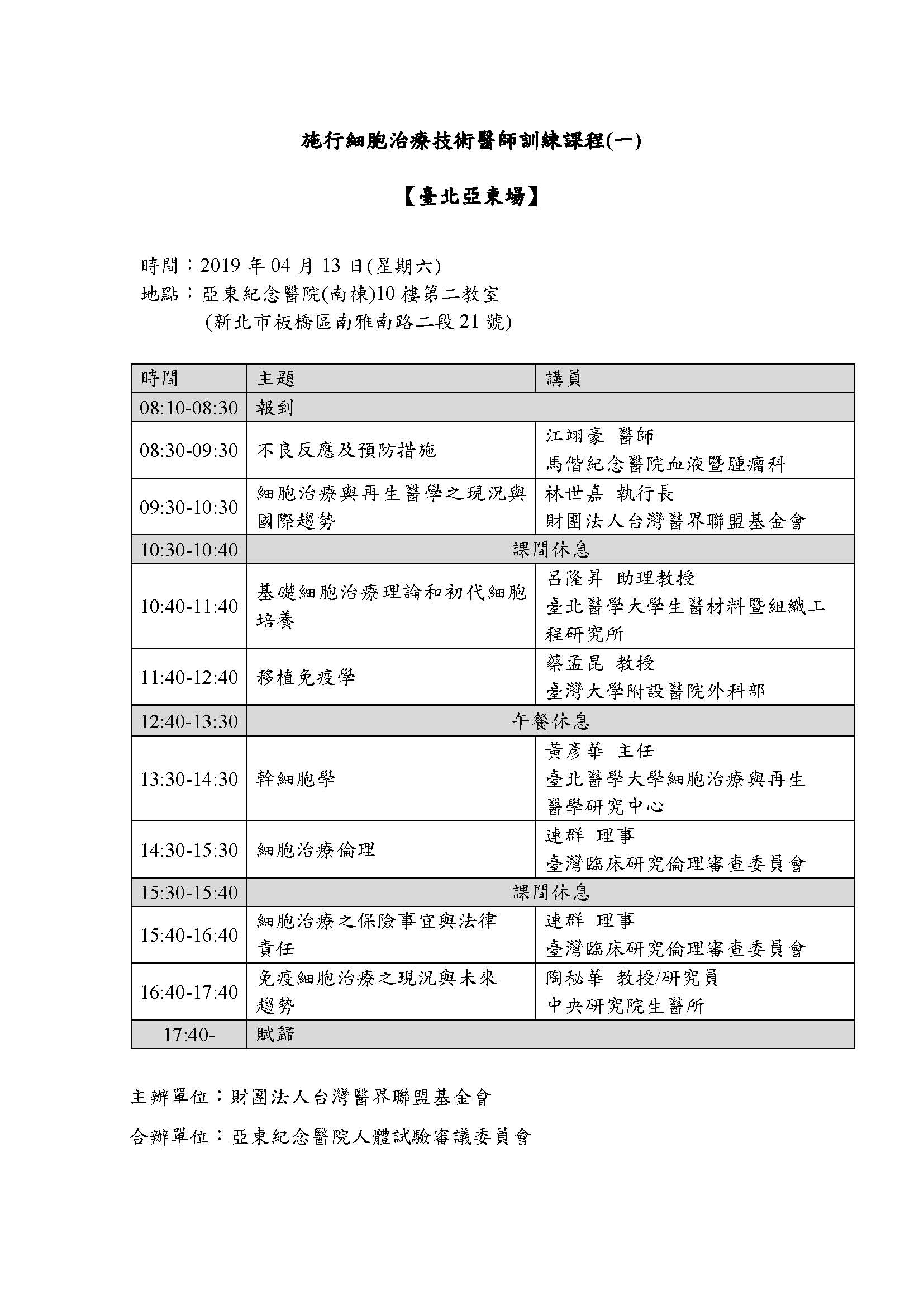 【臺北亞東場】施行細胞治療技術醫師訓練課程