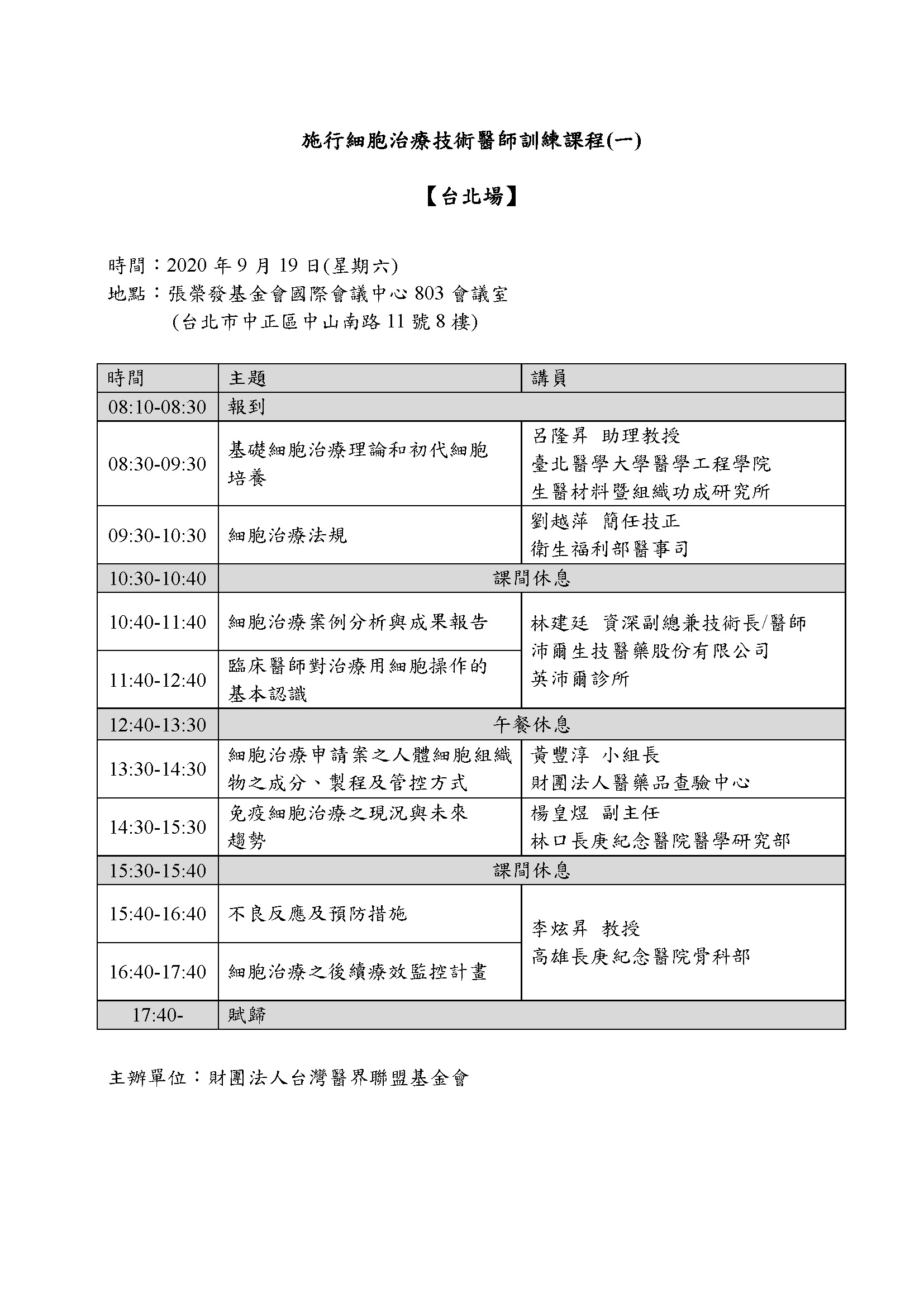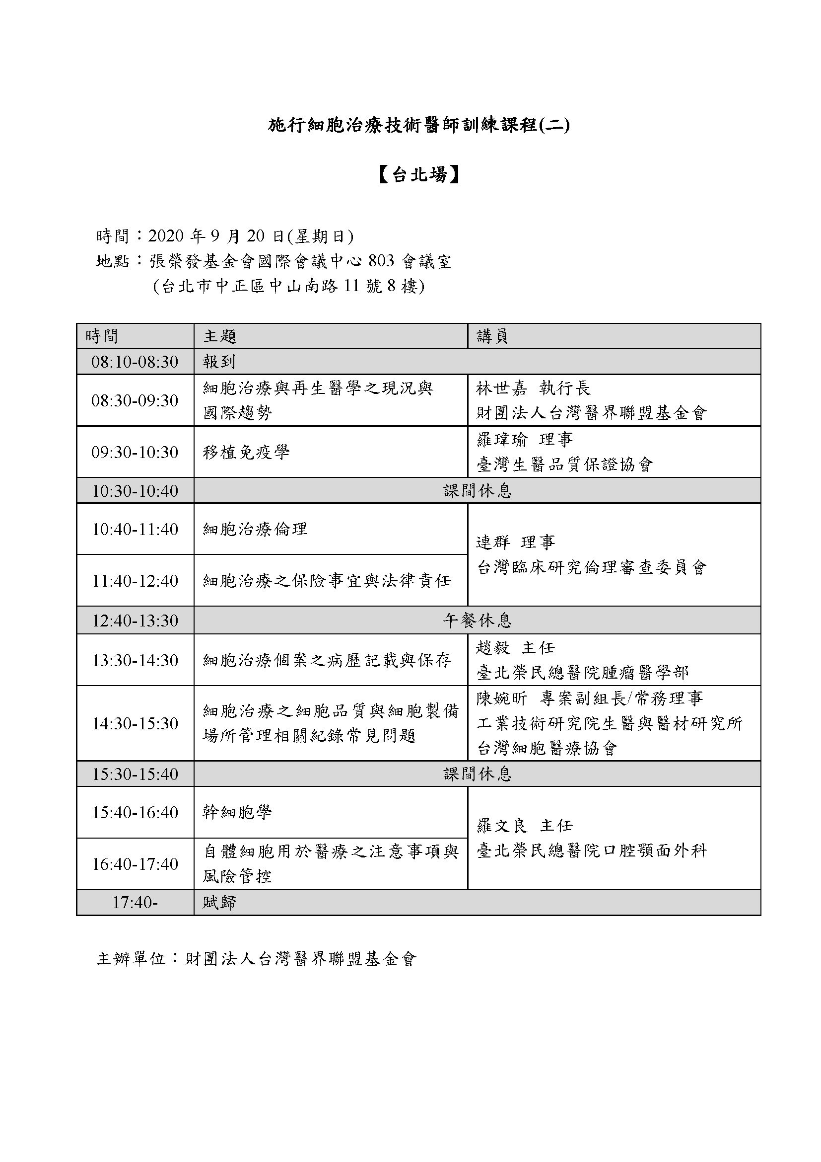 有鑒於衛生福利部於107年9月6日修正「特定醫療技術檢查檢驗醫療儀器施行或使用管理辦法(特管法)」,開放6項細胞治療技術,適用對象包括自體免疫細胞治療,用於標準治療無效的癌症病人與實體癌末期病人;自體軟骨細胞移植用於膝關節軟骨缺損;自體脂肪幹細胞移植用於大面積燒傷及困難癒合傷口等。為協助我國執行細胞治療之醫師及醫療團隊符合工作資格之教育訓練及經驗,財團法人台灣醫界聯盟基金會將於近期辦理「施行細胞治療技術醫師教育訓練課程」,本次教育訓練課程共計安排兩日。內容精采可期,歡迎醫師及有興趣的人員報名,一同加入學習的行列,因名額有限,敬請盡速報名以免向隅。