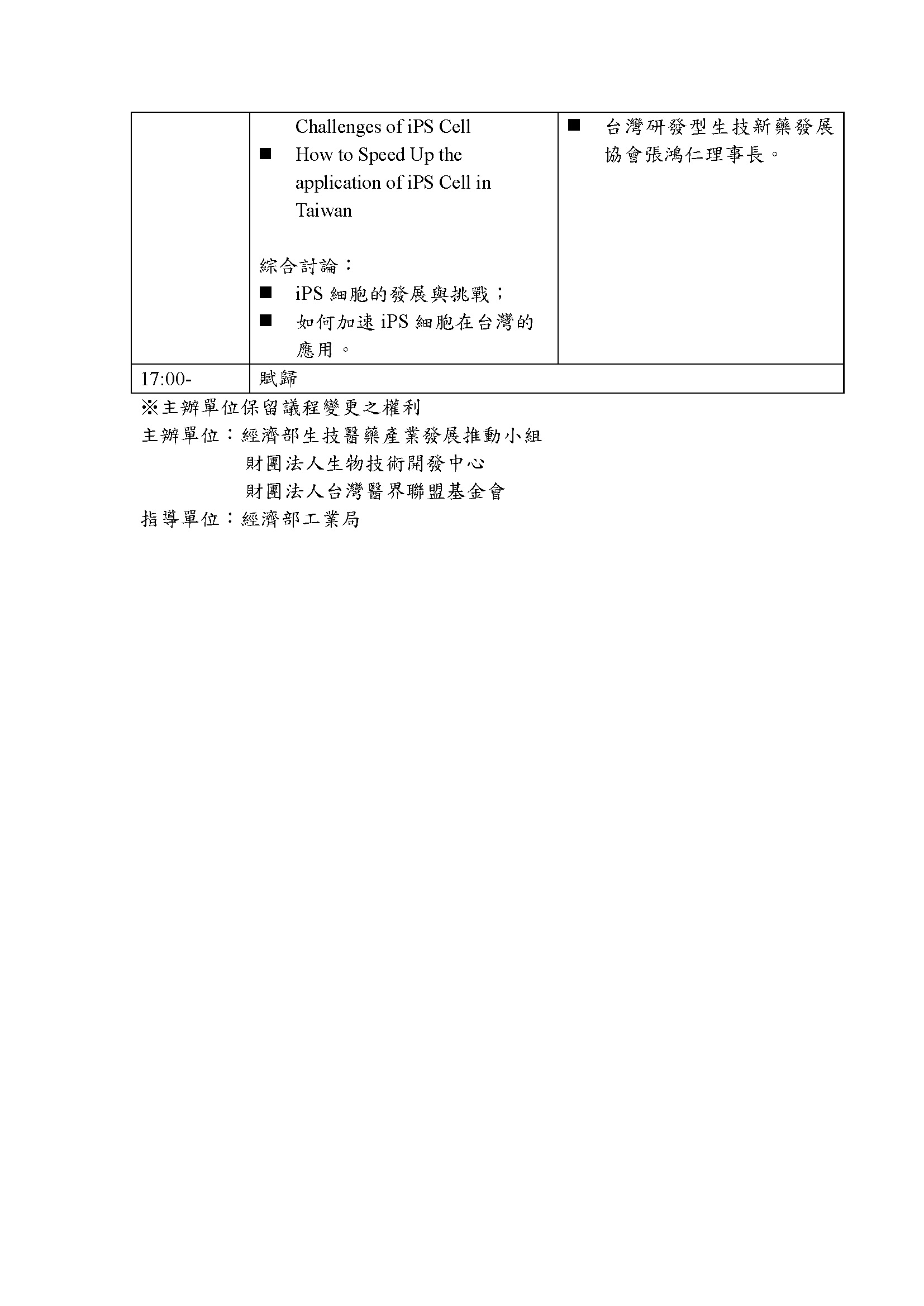 為推動我國再生醫療與國際接軌,藉由外國講者分享誘導型多功能幹細胞(iPS細胞)的學研&產業應用現況與趨勢以及全球再生醫療產業規模化的發展,期望使我國再生醫療各界掌握能全球再生醫療產業最新現況,並促進再生醫療最新知識與我國獨具的產業優勢如醫療、科技結合,為我國再生醫療產業開創全新局面。
