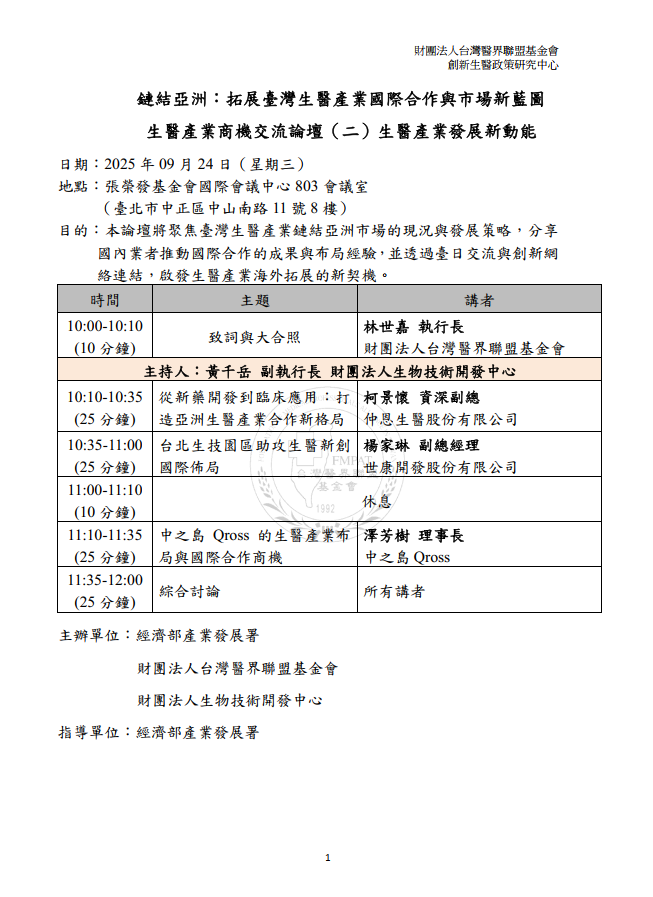 2025年9月24日 生醫產業商機交流論壇(二)鏈結亞洲:拓展臺灣生醫產業國際合作與市場新藍圖