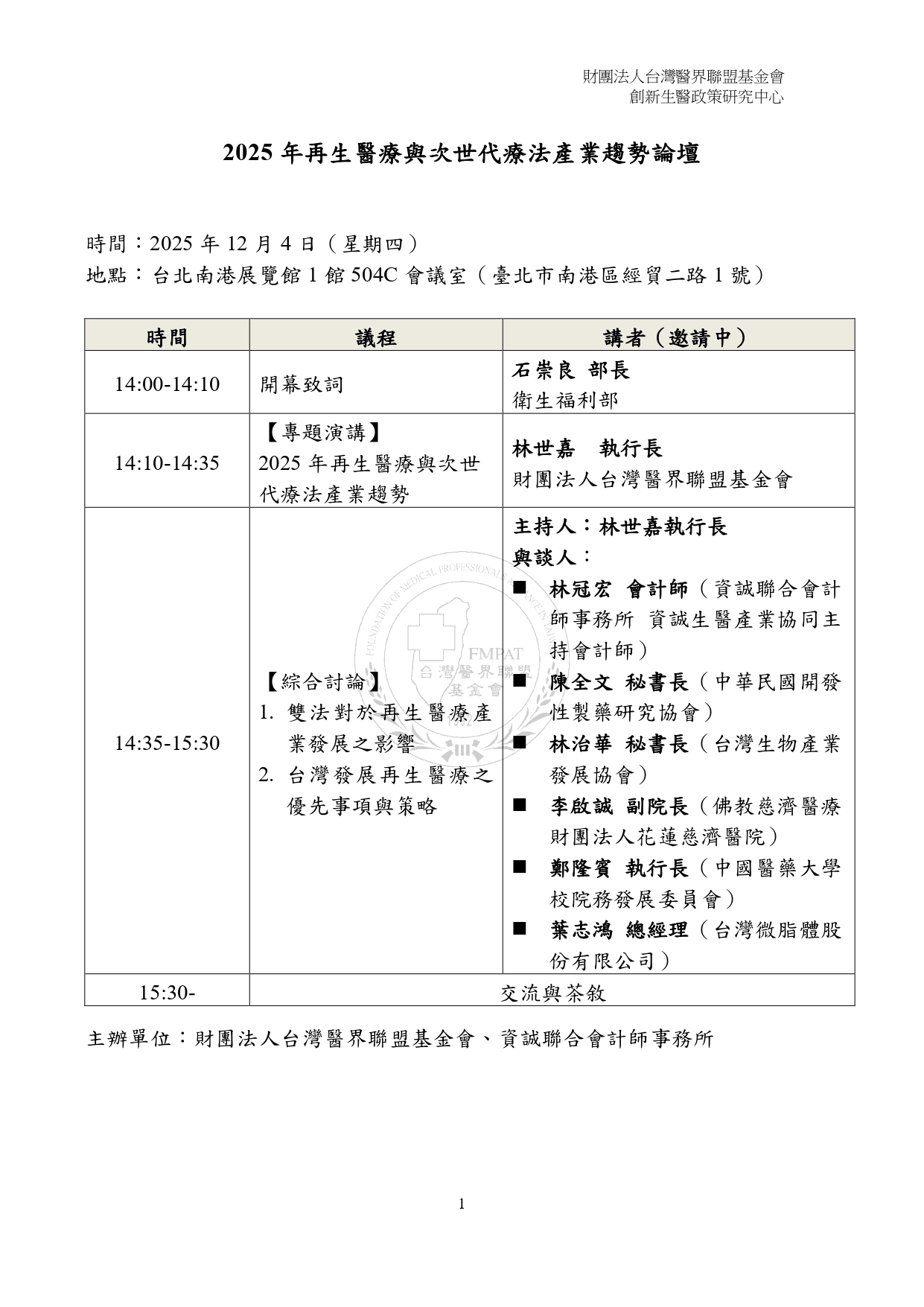 (2) 首度公開《再生醫療與次世代療法產業趨勢研究計畫》完整成果。
